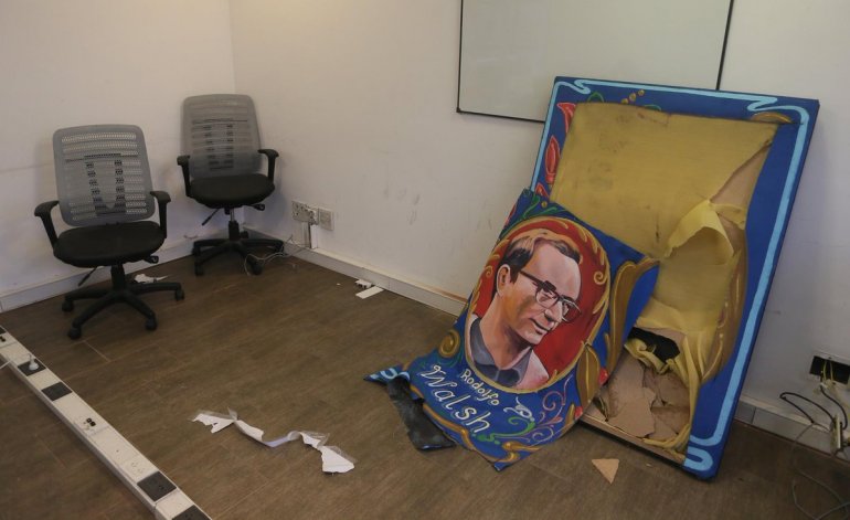 Como mensaje simbólico de lo ocurrido esta madrugada, quedo en el ingreso del diario un cuadro todo tajeado a navajazos, de Rodolfo Wlash, tirado en el piso.