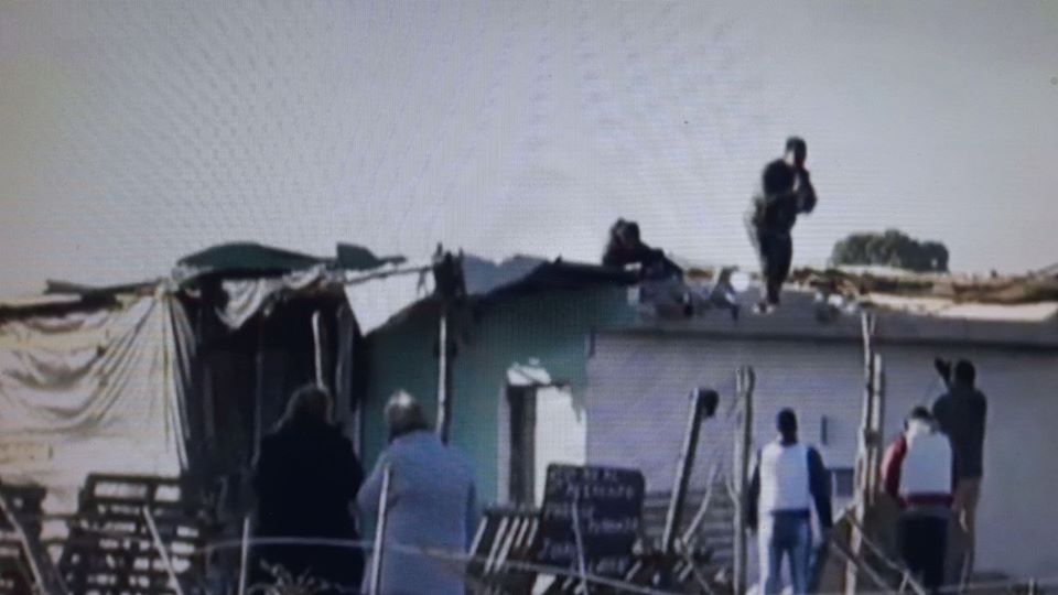 La mujer intenta calmar al hombre, el frio viento polar de esta mañana de otoño nos hace saber el nivel de desesperación que tiene esa familia al resistir desde el techo sus metros de esperanza que le pretenden arrebatar. El hombre le grita a las fuerzas represiva, intenta ser escuchado, no se percibe lo que dice, pero en esta dantesca postal, no es muy difícil imaginarlo.