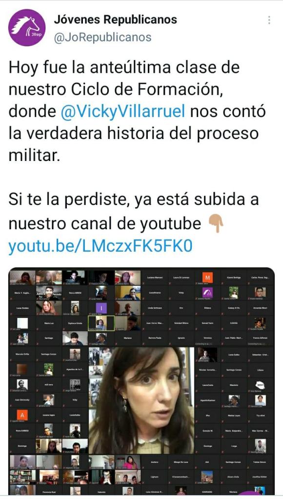 El 31 de agosto de 2020, anunciaban por Twitter: “Hoy fue la ante última clase de nuestro Ciclo de Formación, donde @VickyVillarruel nos contó la verdadera historia del proceso militar”.
