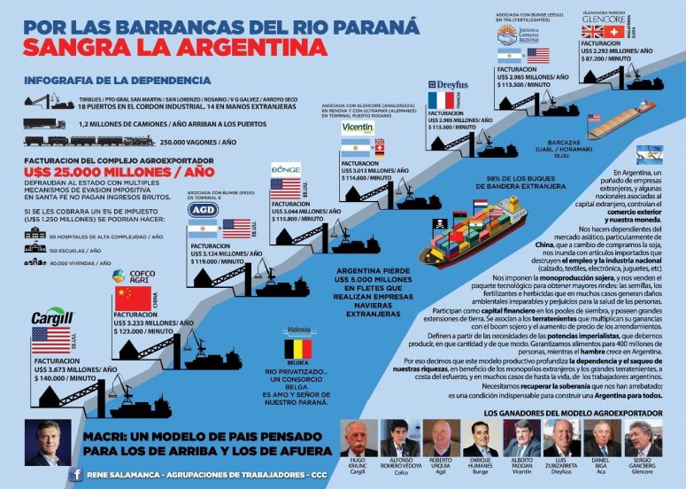 Desde el año 1995, en pleno el auge del proyecto menemista y a la par que se aplicaba el concepto neoliberal el cual afirmaba que, todo lo que sea del Estado, no quedará en manos del Estado, se entregaba el control de la denominada Hidrovia (La red troncal navegable o sistema fluvial y portuario del Paraná, Paraguay, Uruguay y Río de La Plata.) al consorcio Hidrovía SA (conformada por el grupo belga Jan de Nul y el holding argentino Emepa SA) una vía de salida de casi el el 80% de nuestro comercio exterior, un punto de fuga de cereales, carnes, petroleo, minerales, etc.; “por la cual transitan 6.000 barcos extranjeros que no pagan peajes, impuestos, ni tienen controles estatales: un negocio de USD 300 millones anuales”, afirma la periodista Nora Merlin.