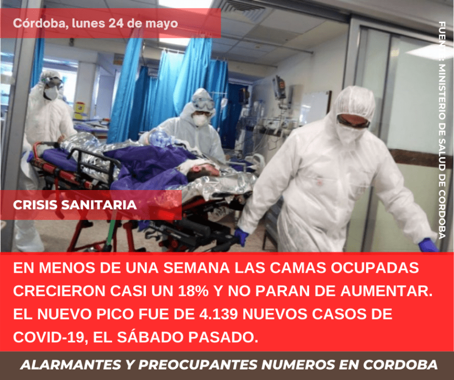 Según datos del Ministerio de Salud de la provincia de Córdoba, el lunes pasado estaban internadas 1.438 personas en camas de unidades para adultos Covid-19, lo que representaba el 43,5% del total de camas en la provincia de Córdoba. Este lunes 24 de mayo, los números treparon de la siguiente manera: “se encuentran internadas 1.844 personas en camas de unidades para adultos Covid-19, lo que representa el 55,8% del total de camas en la provincia de Córdoba”.