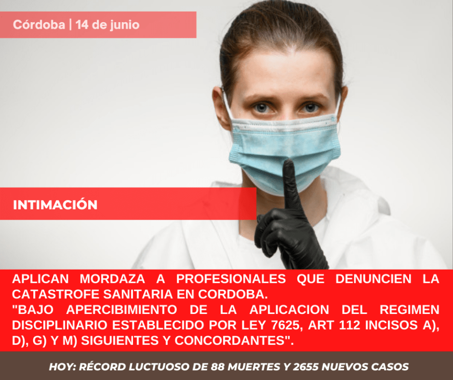 Con 88 nuevas muertes en 24hs., la política sanitaria del gobierno “causa indefectiblemente un temor publico”, cualquier lectura de la realidad por fuera de estos datos “no reflejan la realidad de los hechos”. El nivel de malisia aplicado por el ejecutivo, es directamente proporcional a la mordaza que intenta el gobierno provincial sobre profesionales que denuncien la catástrofe sanitaria.