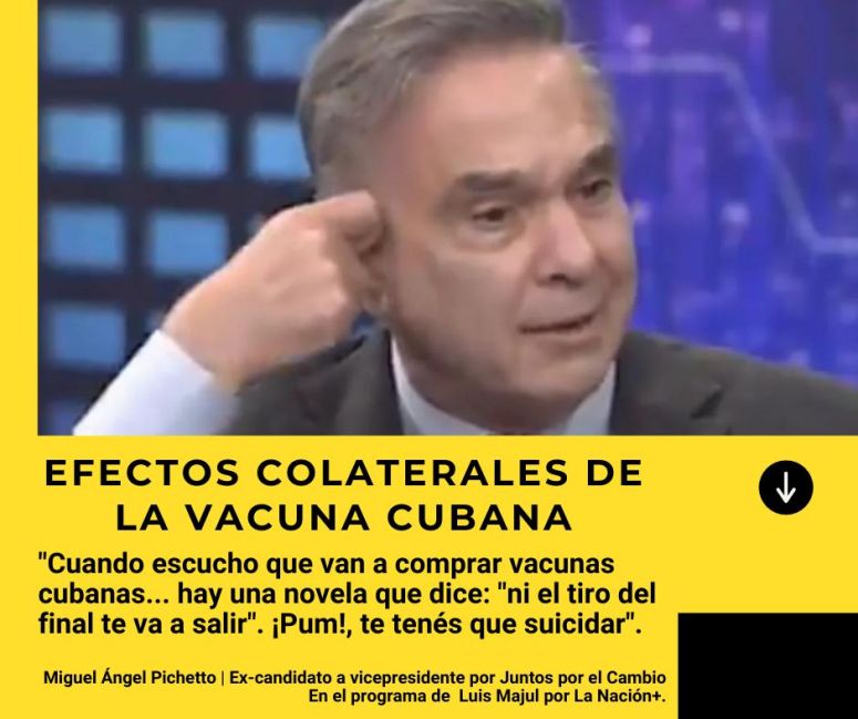 De este modo pasamos de la vacuna con chip, al veneno liquido, a cuerpos imantados y cuando pensamos que ya habíamos escuchado todas las reacciones, aparece un referente de Junto por el Cambio alarmado por la vacuna cubana y anuncia suicidios en masa o su expresión desesperada de saber que una isleta con mas de 60 años de bloqueo está produciendo unas de las vacunas más exitosas del planeta.