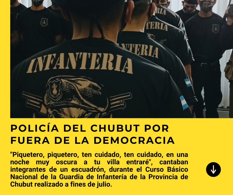 Hace un par de días corrió por las redes sociales un video grabado y subido al Facebook de Prensa de la Policía de Chubut (hoy borrado de su cuenta) donde se veía el desfile al trote de un escuadrón de la fuerza mientras cantaban por las calles de un Club Deportivo: «Piquetero, piquetero, ten cuidado, ten cuidado, en una noche muy oscura a tu villa entraré». El inequívoco mensaje se complementa con otro video de la misma fuente en la cual se puede observar como la fuerza se entrena para desalojar un piquete. Estos videos se corresponderían al VIII Curso Básico Nacional de la Guardia de Infantería de la Provincia de Chubut.
